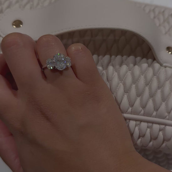 De ring is vervaardigd uit hoogwaardig 925 sterling zilver en bezet met drie prachtig geslepen ovale moissanite-stenen.De centrale steen wordt geflankeerd door twee kleinere stenen.